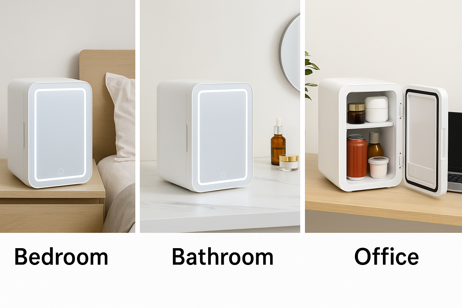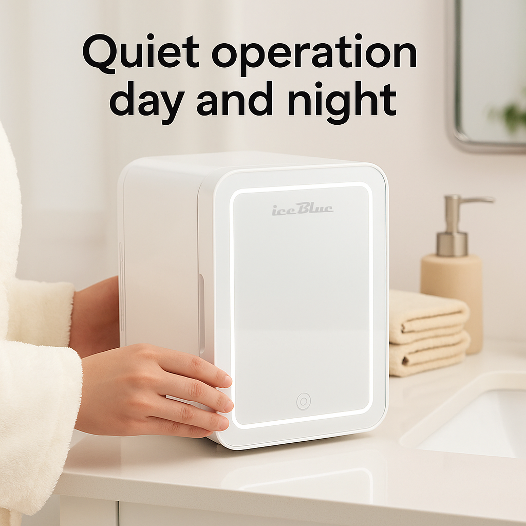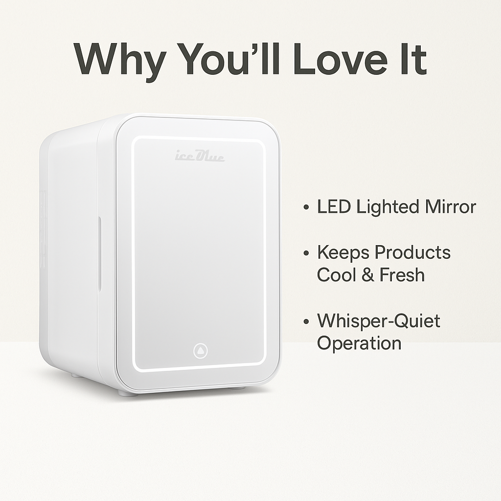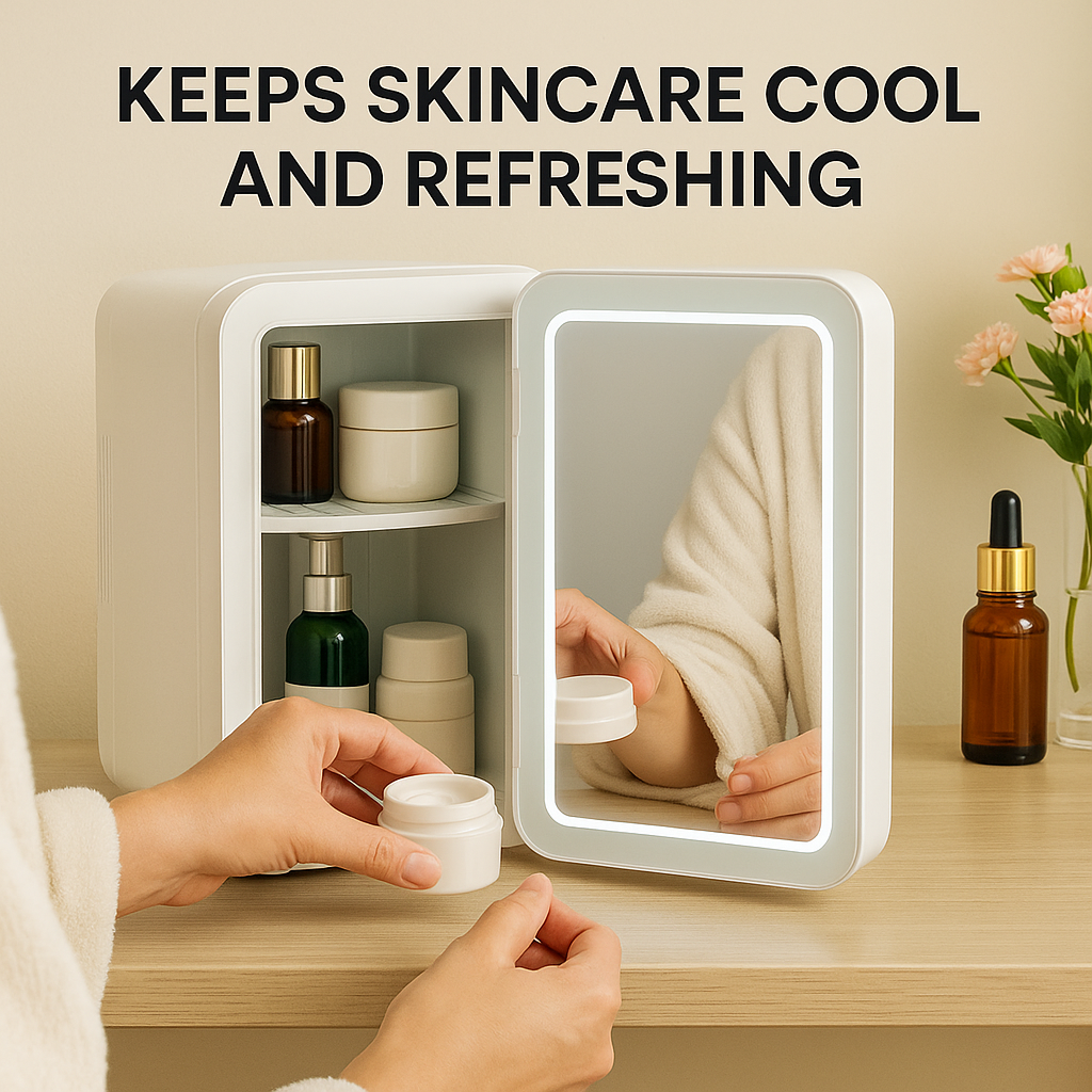 Cool your skincare, elevate your ritual. This sleek mini fridge preserves your products at the perfect temperature for longer shelf life and enhanced results — because your glow deserves nothing less. Ideal for serums, creams & facial tools. Stylish, compact & quiet. LED-lit mirrored door for a touch of luxury